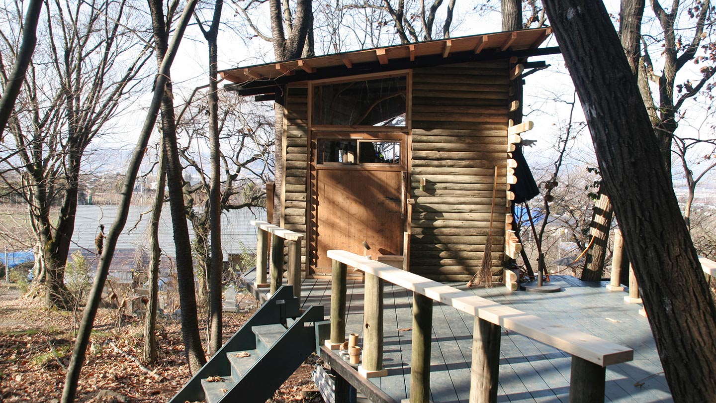 2012年、浄光寺の敷地内に建てたツリーハウスづくりの様子。林さんによれば「小布施や近隣の人たちが寄ってたかって(笑)作り上げた友情の館(秘密基地)」とのこと。写真手前が林さんのご息女で、奥がご子息の林映心さん(画像提供:林映寿さん)
