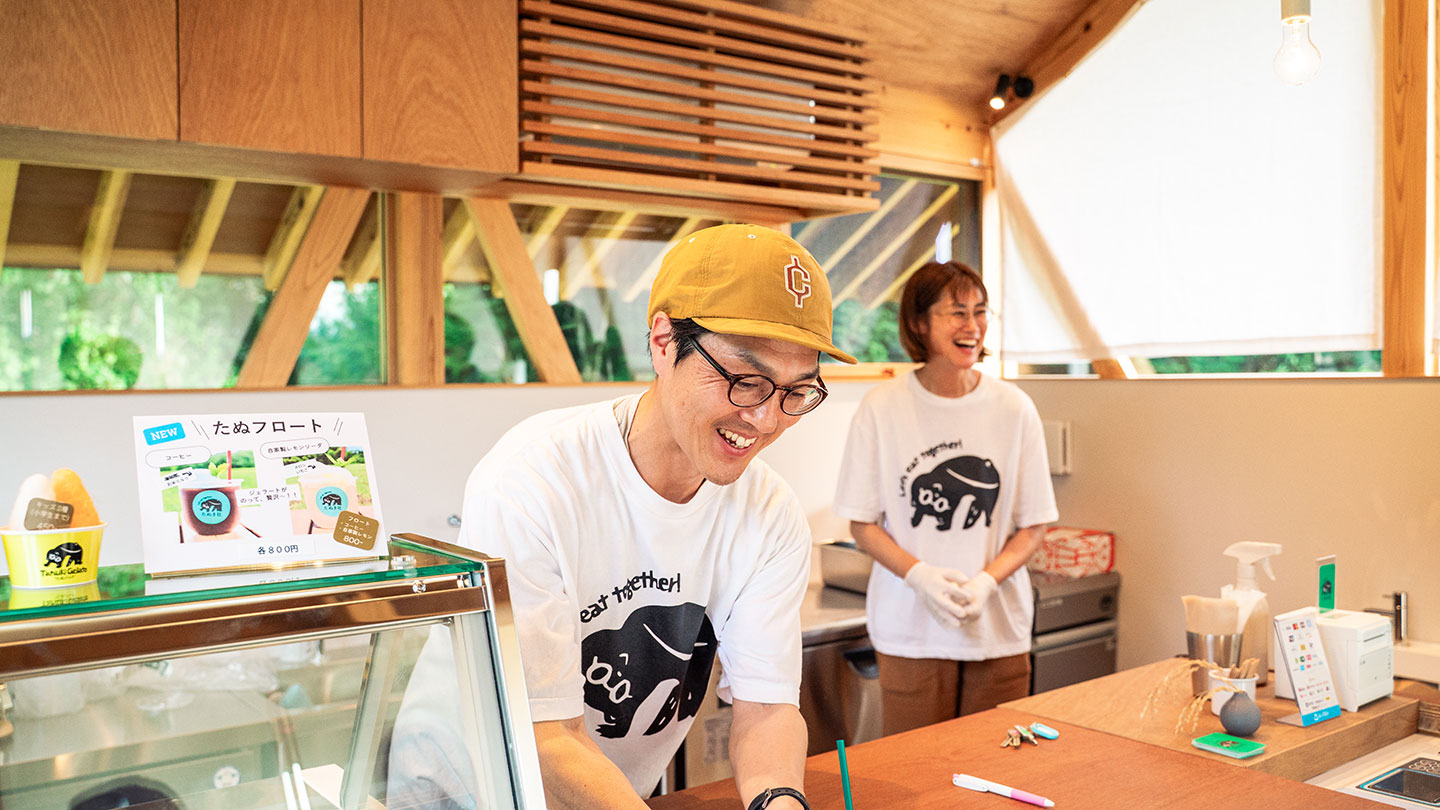 そこで、農業を起点に、周辺の事業や文化を結びつけた「地域産業」をつくりたいという思いから、2024年12月にオープンしたのが「たぬき社」です。お米からつくったジェラートやバームクーヘンなどの販売店に、カフェを併設しています。