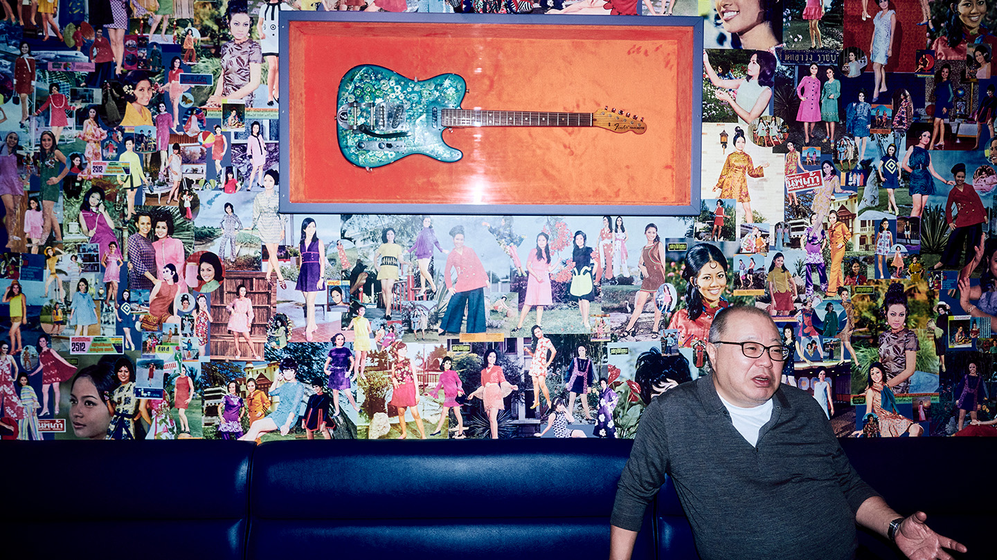 今回の取材は、都築さんが内装を手がけた赤坂の「bar FLOWERS」にて実施。壁面には都築さんが高校時代に購入したフェンダーのギターと、自身で収集していた1960~70年代のタイのファッション誌の切り抜きが一面に貼られている